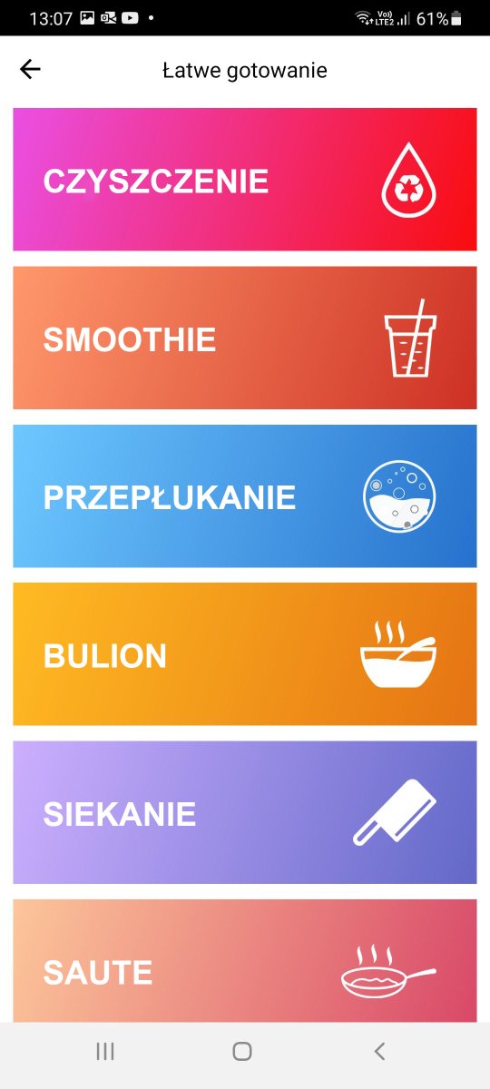W oprogramowaniu wbudowane jest 18 automatycznych programów: Czyszczenie, Smoothie, Przepłukanie, Bulion, Siekanie, Smażenie Saute, Mieszanie, Wyrabianie ciasta, Gotowanie na parze, Duszenie, Utrzymywanie ciepła, Podgrzewanie, Gotowanie, Jogurt, Ryż, Owsianka, Kleik ryżowy, Zupa krem.