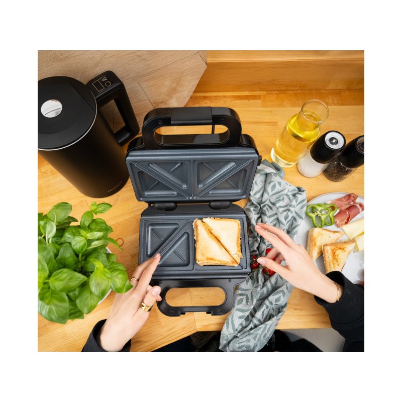 Minimalistyczne, matowe wykończenie sprawia, że opiekacz świetnie prezentuje się na kuchennym blacie. Niewielkie wymiary (235 × 245 × 100 mm) gwarantują, że zmieści się w każdej kuchni, a solidny uchwyt i kontrolki informujące o gotowości do pracy dbają o pełen komfort użytkowania. Moc 750 W oraz maksymalna temperatura 205°C ± 15°C pozwalają szybko nagrzać urządzenie i uzyskać idealny efekt pieczenia bez długiego czekania.