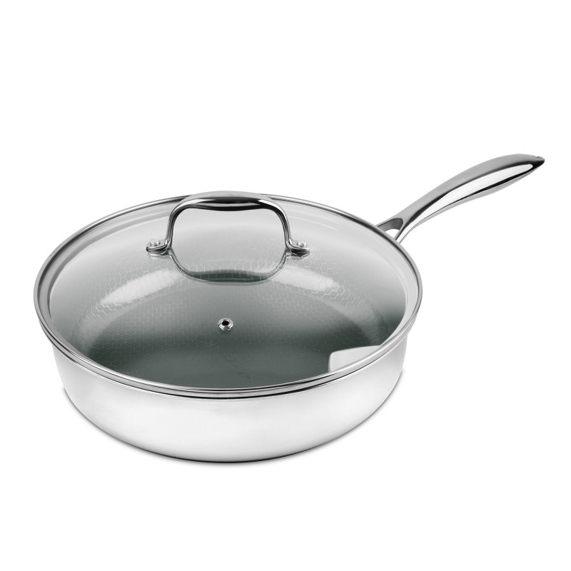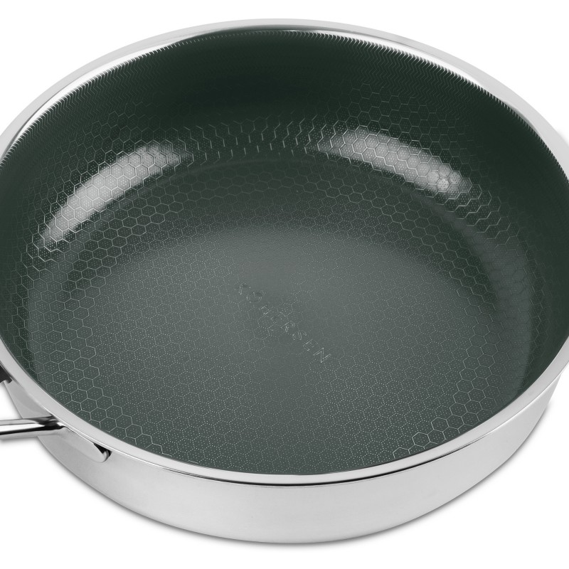 Patelnia Kohersen NXCERAMIC Saute 26 cm posiada hybrydową konstrukcję TRI-PLY: stal nierdzewna - aluminium - stal nierdzewna. Trójwarstwowa budowa zapewnia niezwykłą trwałość, odporność na odkształcenia i doskonałą przewodność cieplną. Dzięki temu powierzchnia osiąga pożądaną temperaturę w bardzo krótkim czasie, umożliwiając szybsze gotowanie i oszczędzanie energii. Spodnia warstwa z magnetycznej stali nierdzewnej sprawia, że patelnia jest idealna do kuchenek indukcyjnych, a także można jej używać w piekarniku do 300°C. Gotujesz szybciej, oszczędzasz energię, obniżasz wydatki.