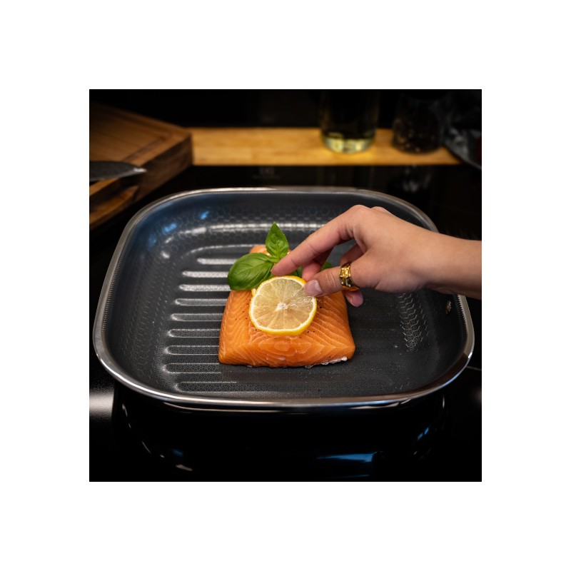 Patelnia grillowa Kohersen® NX CERAMIC 26 cm pozwala cieszyć się smakiem grillowanych potraw o każdej porze roku. Charakterystyczna ryflowana powierzchnia umożliwia przygotowanie perfekcyjnie przypieczonych steków, ryb, warzyw czy serów z apetycznym wzorem grillowych pasków – bez potrzeby używania tradycyjnego grilla.
