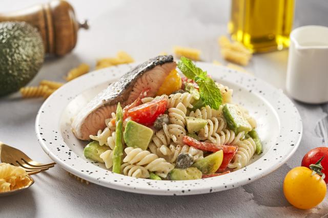 - Odcedź makaron, łososia i szparagi. Wszystko przełóż do dużej miski i dodaj 30 g papryki czerwonej, 120 g awokado, 30 g pomidorków, 200 g jogurtu, 1/2 łyżeczki soli i 1/2 łyżeczki pieprzu. Całość dokładnie wymieszaj.