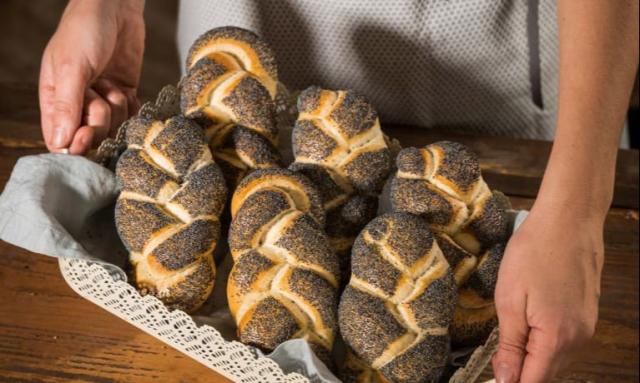 8. Pougniataj ciasto, aby uwolnić powietrze. Uformuj 2 wałki o długości około 40-50 cm. Zawiń wokół siebie oba kawałki ciasta, by otrzymać warkocz. Posmaruj warkocz wodą i posyp 1 łyżeczką maku. Umieść go na papierze do pieczenia i przykryj kuchenną ściereczką. Całość powtórz dla pozostałych porcji ciasta. Pozostaw je na 40 minut. W międzyczasie kontynuuj przepis.