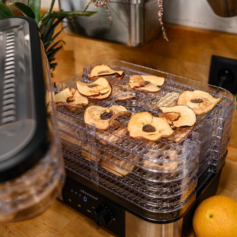 Dzięki kompaktowej obudowie i nowoczesnemu designowi, suszarka idealnie sprawdzi się w każdej kuchni. Pracuje cicho, równomiernie i bez konieczności ciągłego pilnowania. Susz żywność sezonową, przygotowuj zdrowe przekąski, chipsy z warzyw, domowe herbaty z suszonych owoców czy przyprawy z własnego ogrodu – przez cały rok!