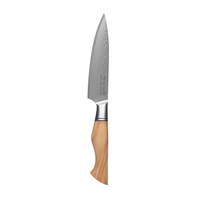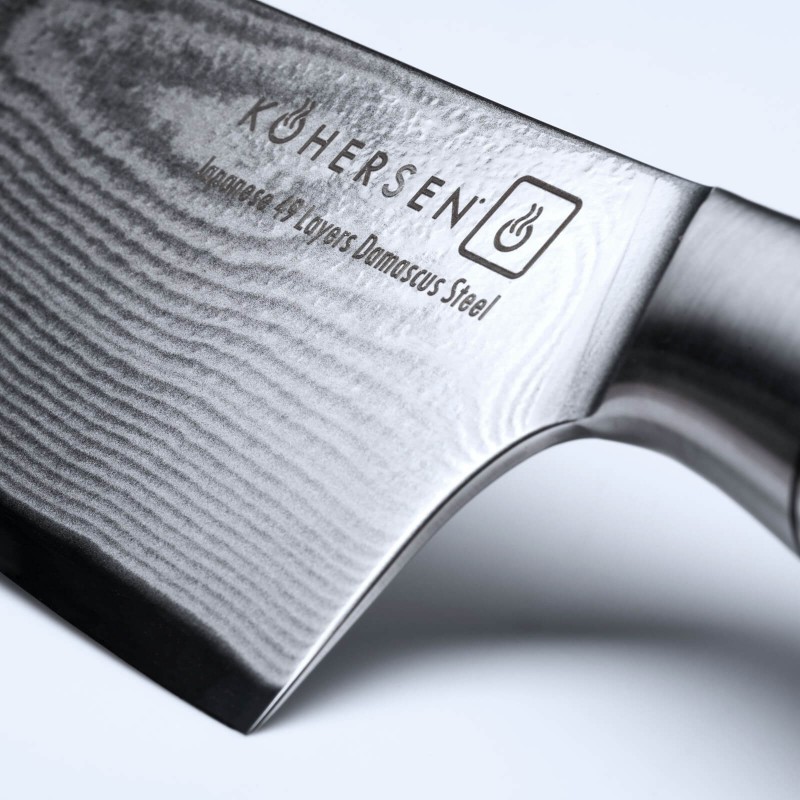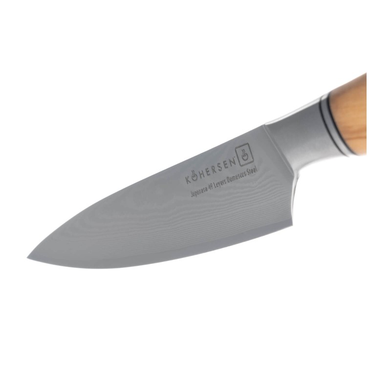 Oryginalne wzory na klindze powstają podczas polerowania ostrza o wielowarstwowej budowie. Dzięki odpowiedniemu składowi chemicznemu zalicza się do stali nierdzewnych i nie ulega korozji. Noże Kohersen z kolekcji Professional Olive Wood powstają z 49-warstwowej, japońskiej, proszkowej stali damasceńskiej o twardości 63 (+/-1) HRC (w skali Rockwella).