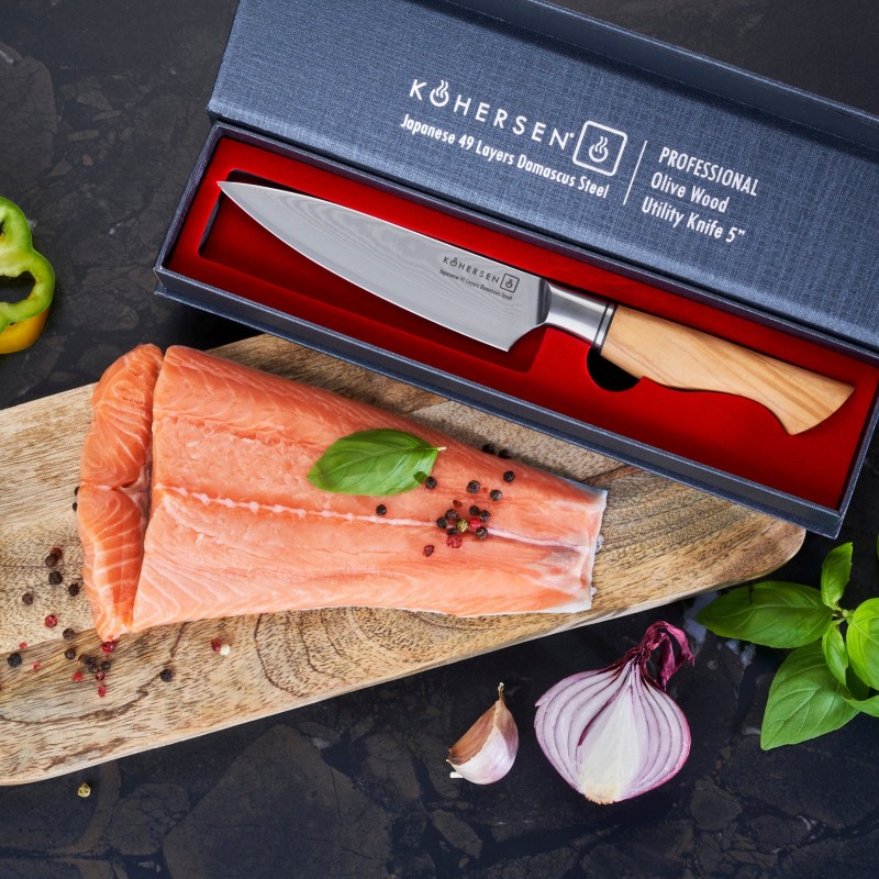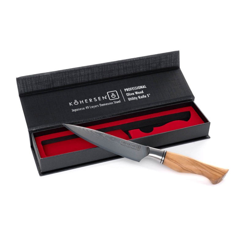 Nóż uniwersalny UTILITY Kohersen® Professional Olive Wood 12,7 cm + Magnetyczna pochwa z drewna oliwnego